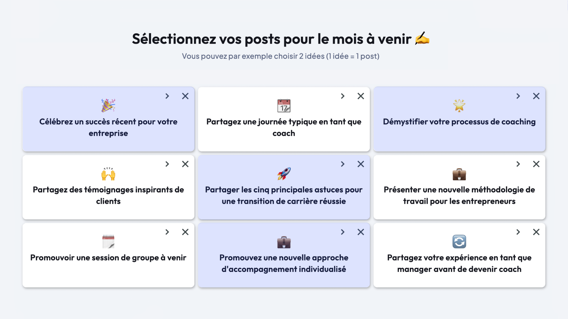 Obtenez vos 4 posts LinkedIn sur-mesure, conçues spécifiquement en fonction de vos besoins LinkedIn. Le tout en 5 minutes.