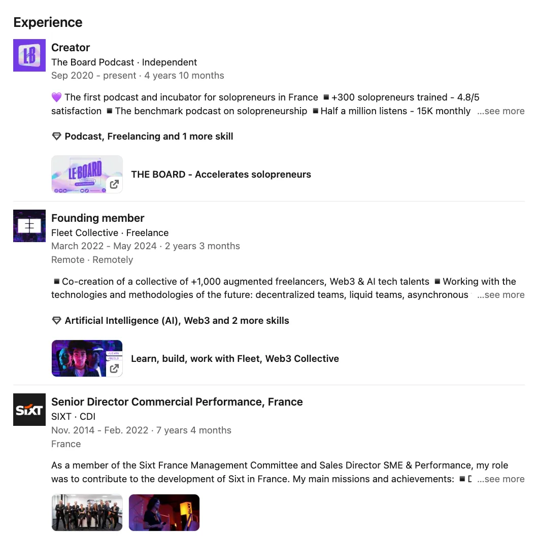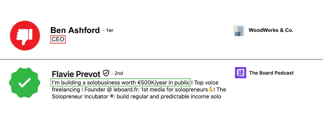 ✅ Lilian Mouchard & Théo Fontenit: “Your LinkedIn posts for 1 full month in under 30 min ✨ | Co-founder Lyter & Metcher 👨 💻” → Strong and quantified promise + concrete benefit (time savings + LinkedIn content)
