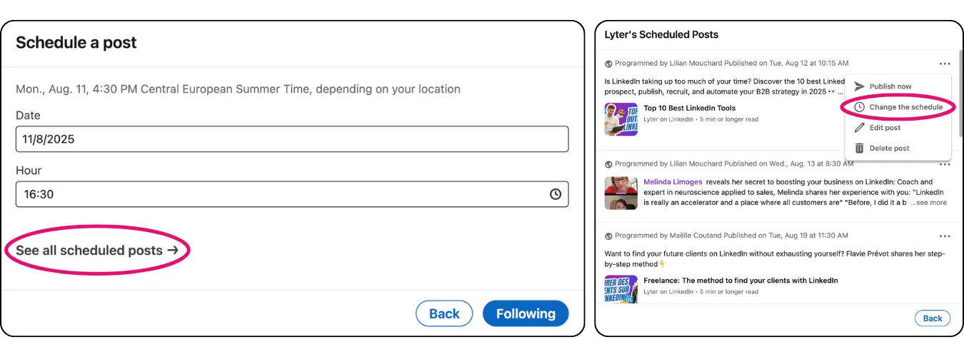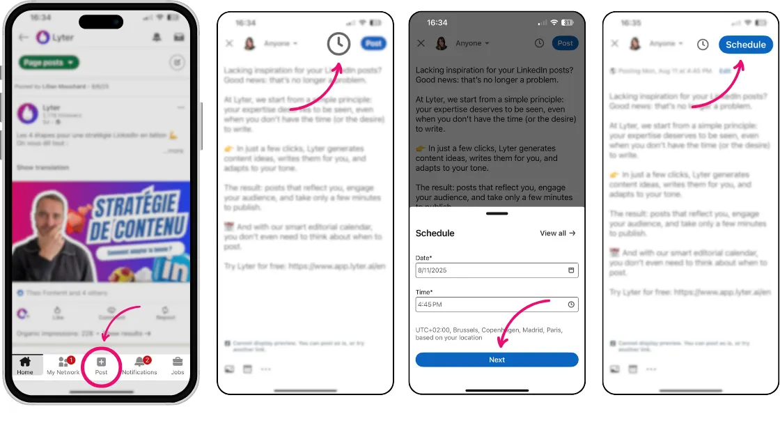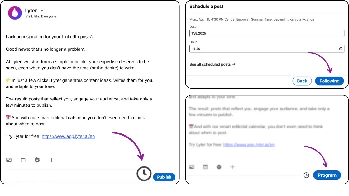 On LinkedIn, consistency is king. And good news: scheduling your posts has never been easier. Whether you choose to use the native tool or more advanced solutions like Lyter, the aim is to keep your visibility without devoting your evenings to it.