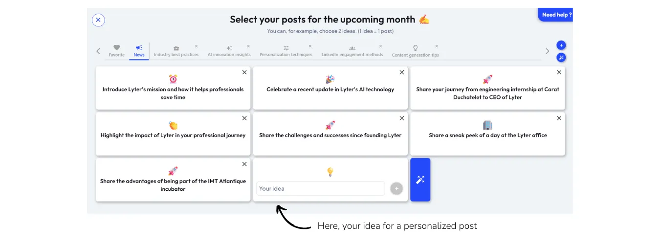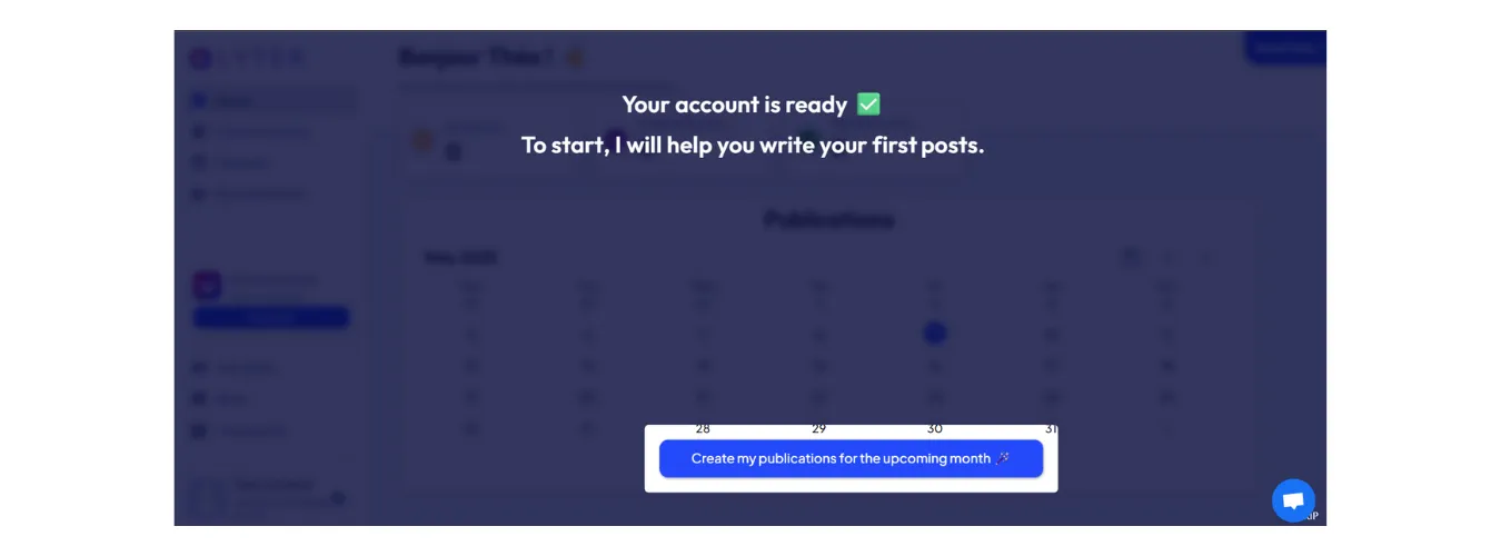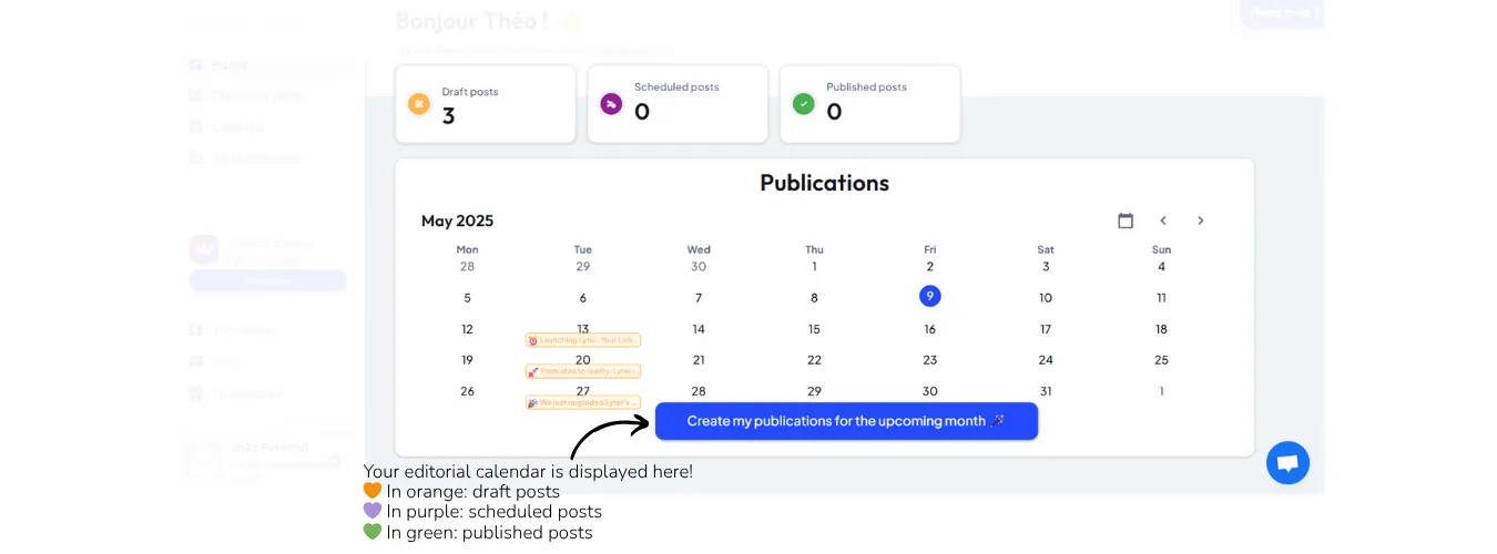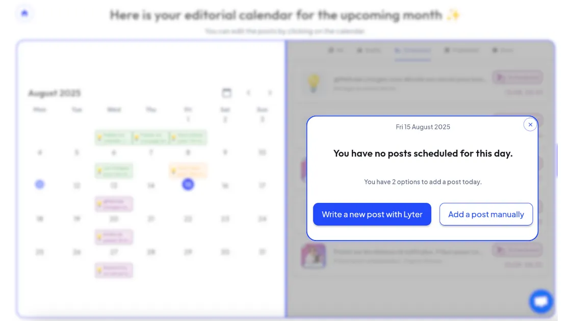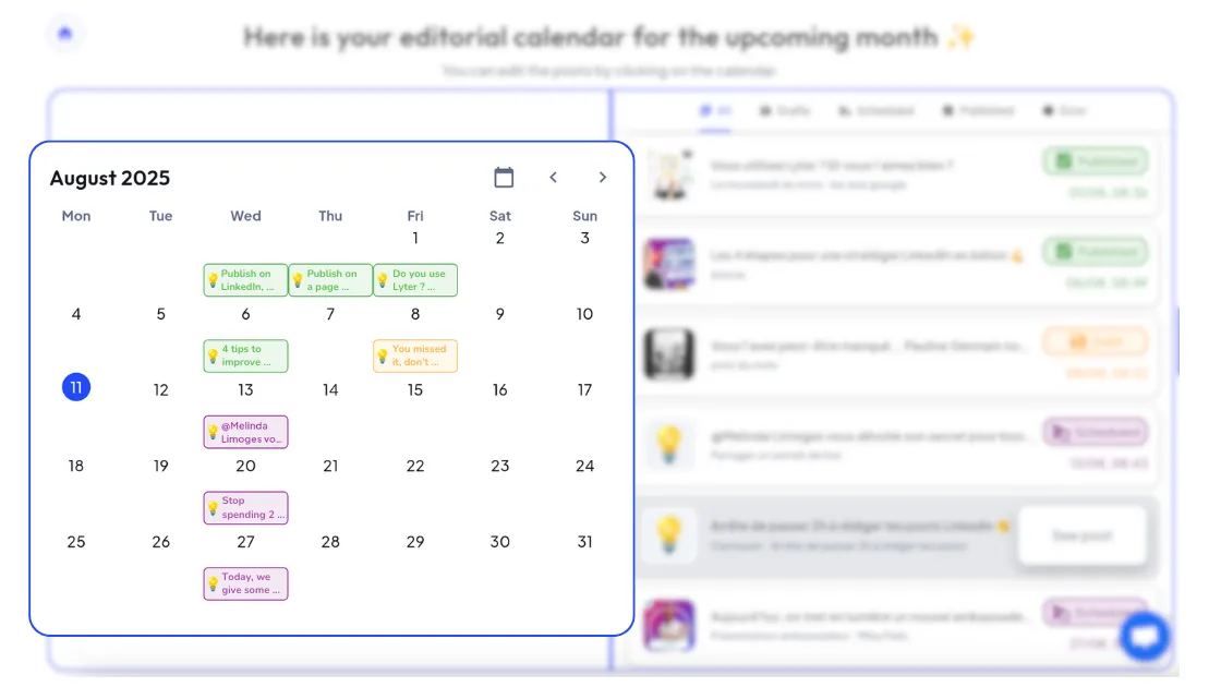 Click on the “Create my posts for the coming month” button or go directly to your editorial calendar to choose the publication date. Then, select one of Lyter's ideas, or add your own.