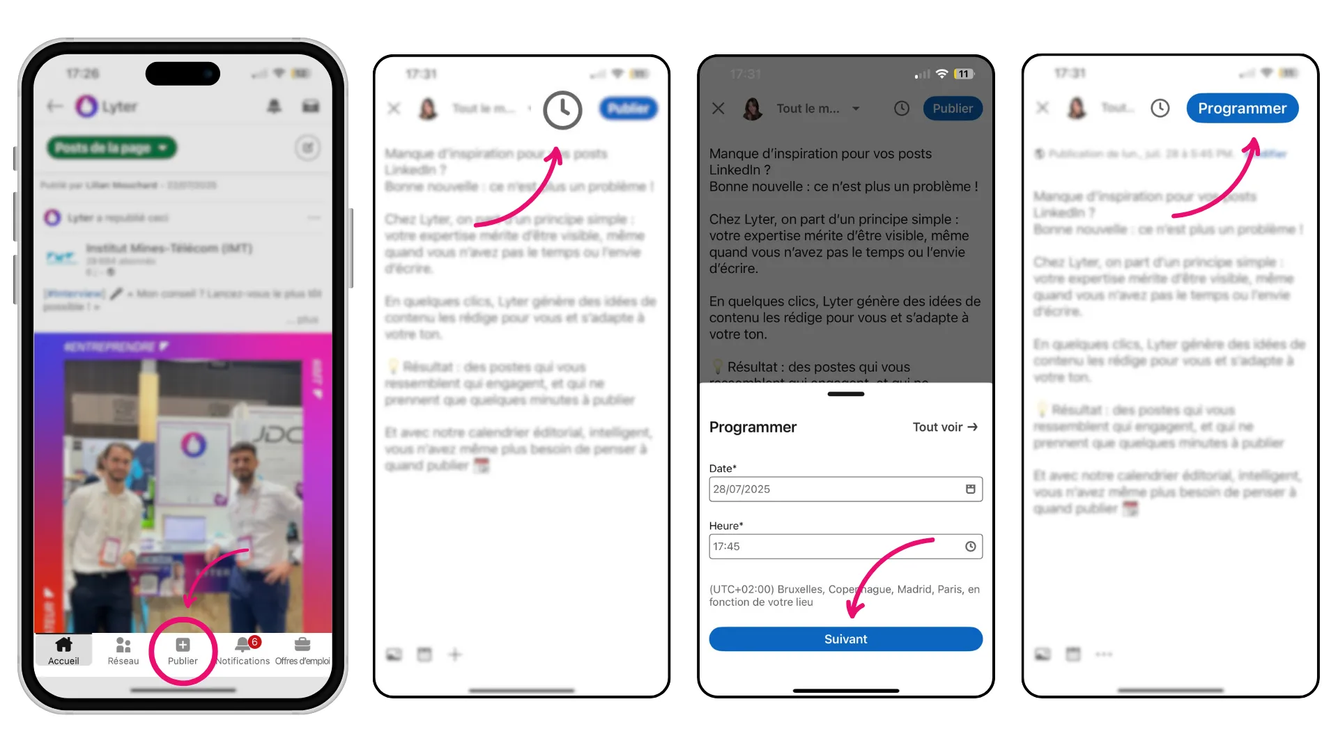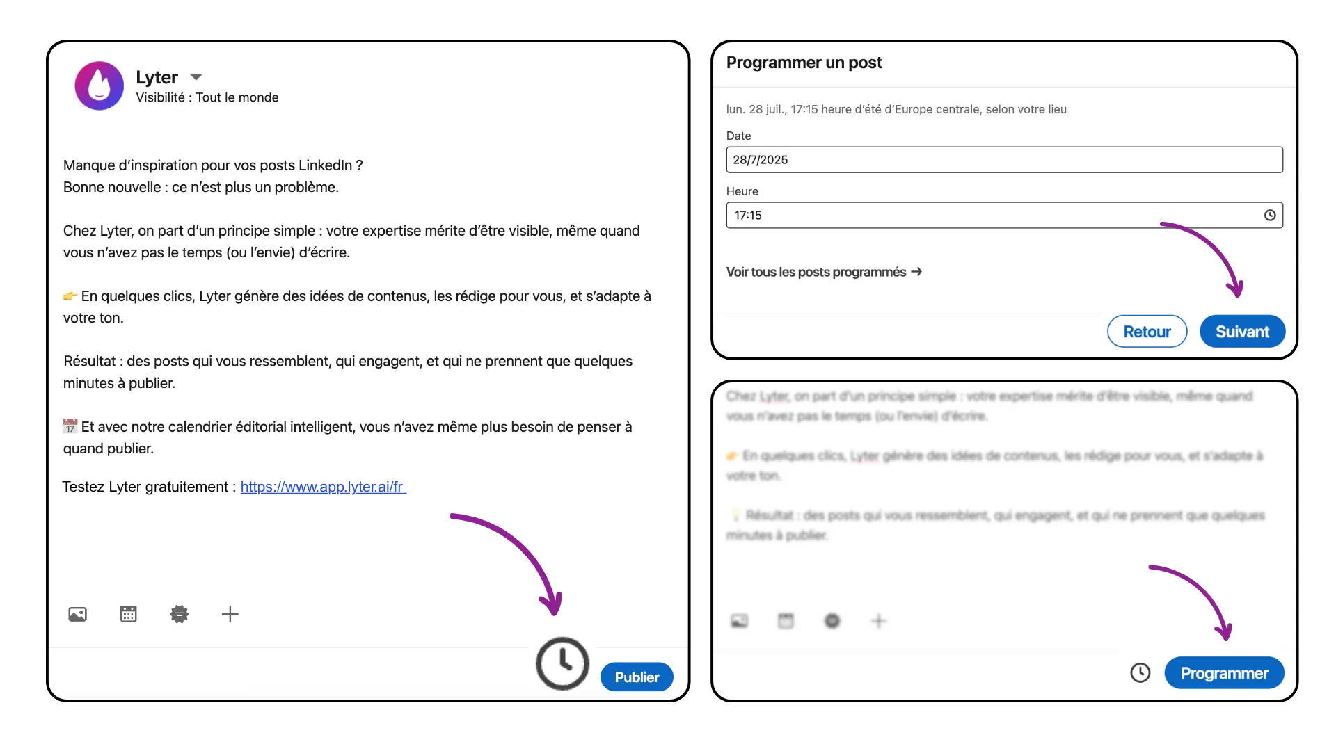 Certes, LinkedIn propose une option de programmation native. Mais pour vraiment tirer parti de votre contenu, Lyter pousse la logique plus loin avec plusieurs atouts :