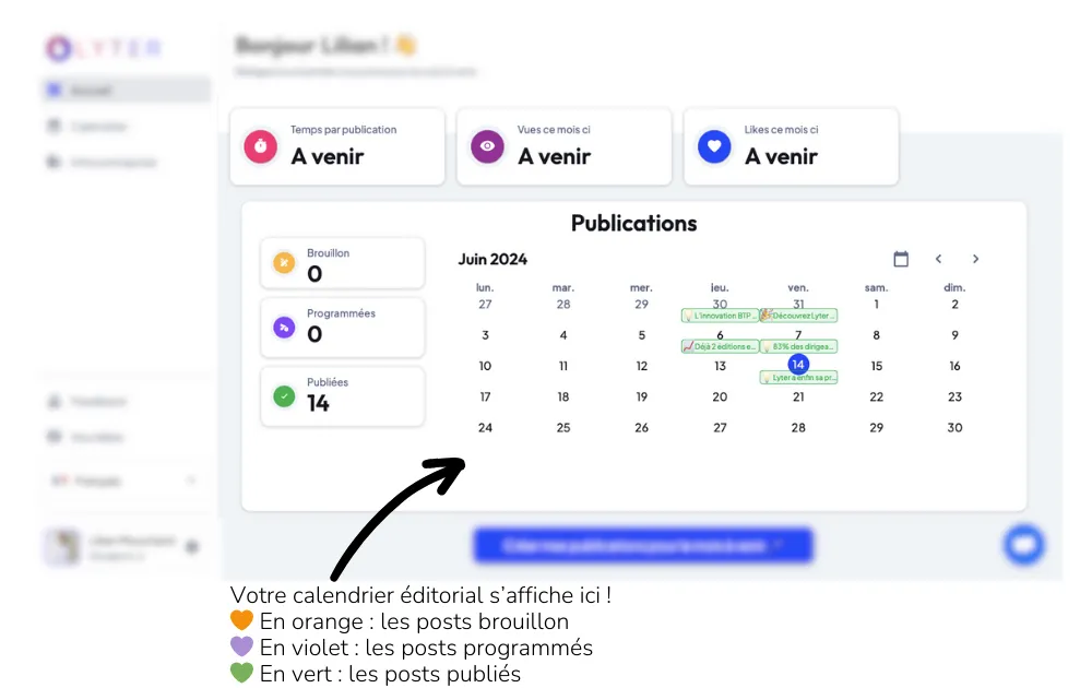 Pas de souci ! Vous pouvez aussi cliquer directement sur la date souhaitée dans votre calendrier éditorial, qui s’affiche automatiquement dès votre connexion. Lyter vous proposera alors de rédiger le post pour vous… ou de le faire vous-même, si vous préférez garder la main.