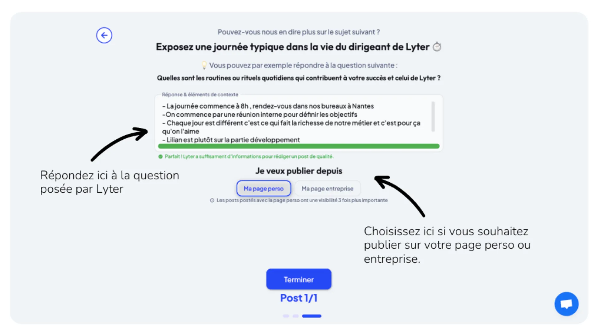 Analyse de votre profil, compréhension des tendances de votre secteur, génération d’idées percutantes... Lyter va droit au but : des contenus clairs, engageants et prêts à être publiés ou ajustés à votre sauce.