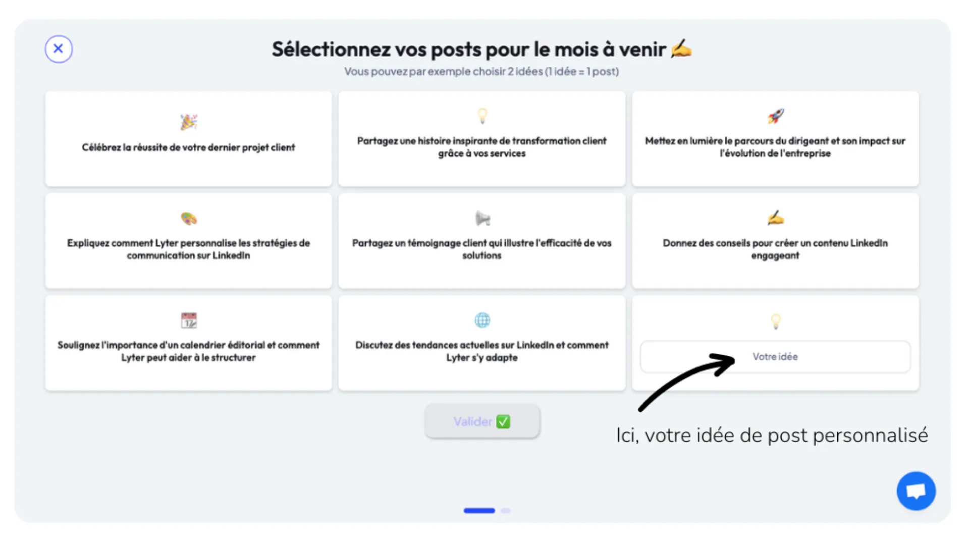 Cliquez sur le bouton "Créer mes publications pour le mois à venir" ou accédez directement à votre calendrier éditorial pour choisir la date de publication. Ensuite, sélectionnez l'une des idées proposées par Lyter ou ajoutez la vôtre.